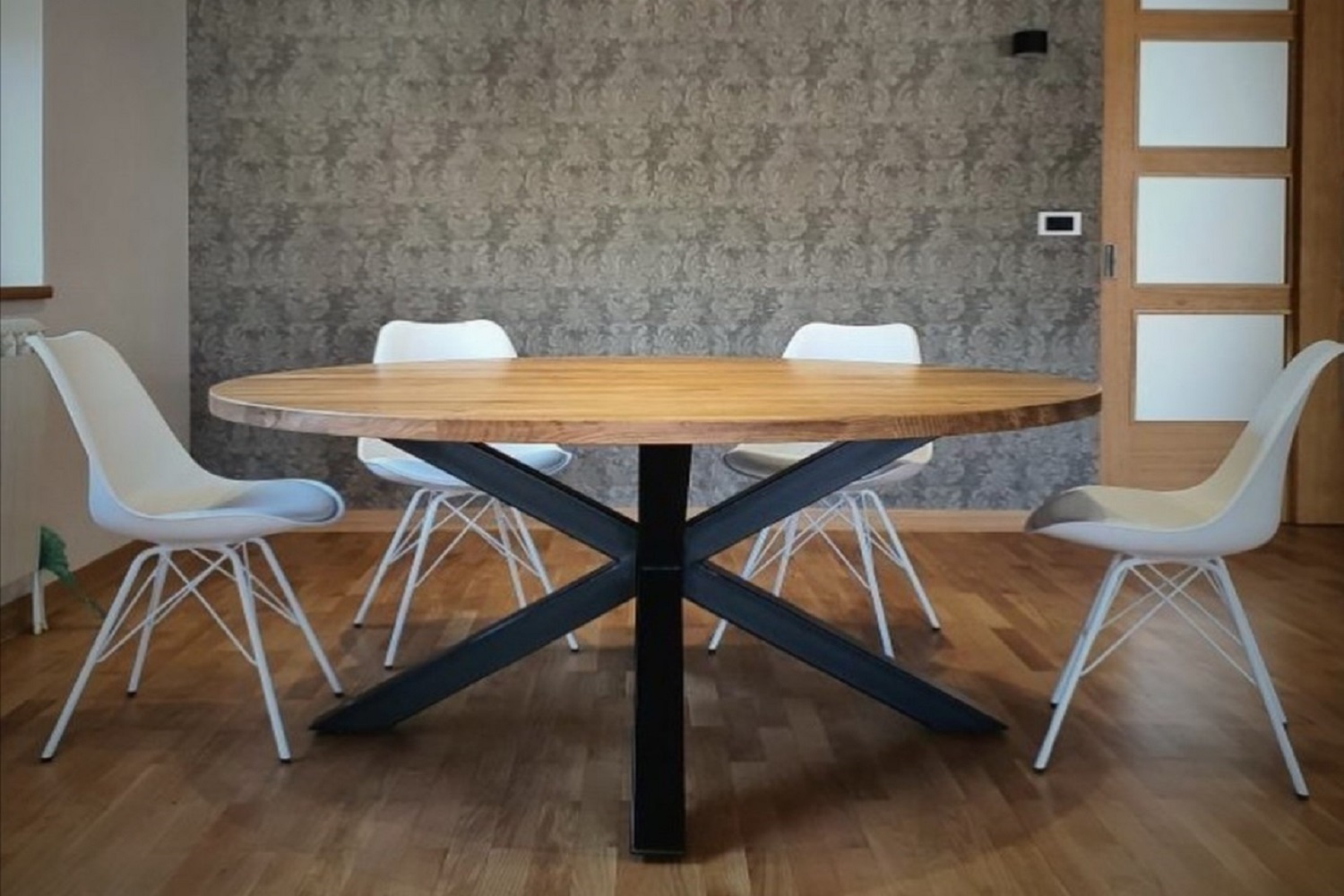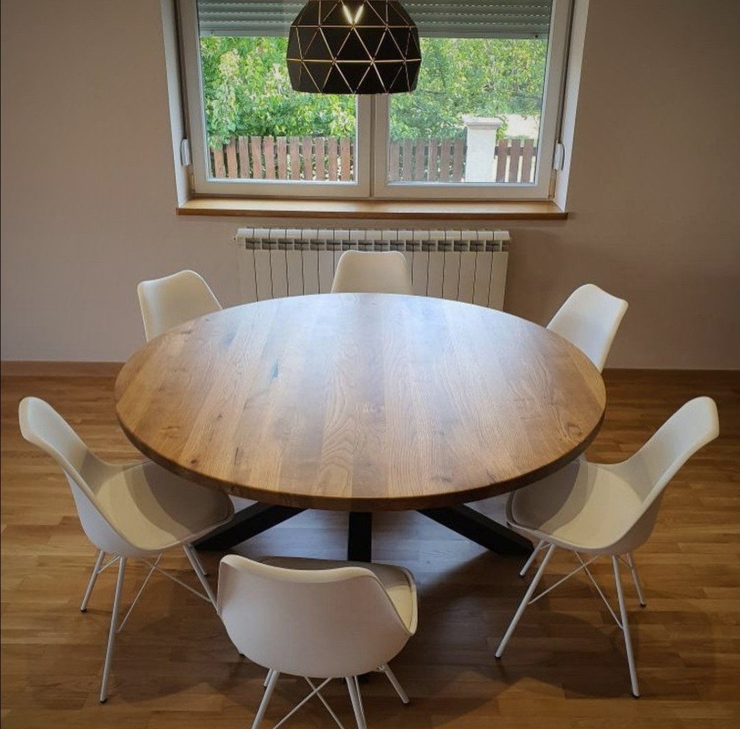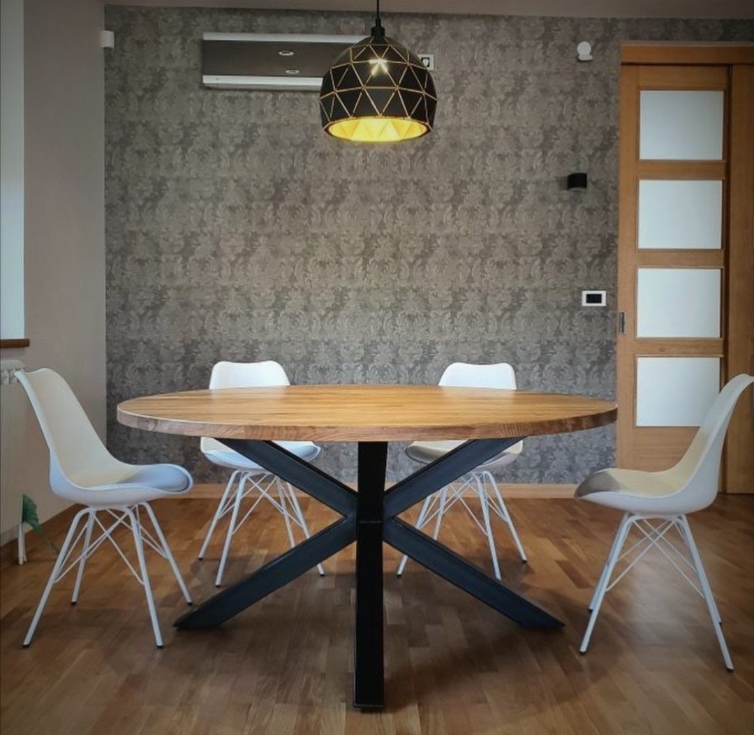 Okrągły stół na wymiar, z możliwością wykonania w każdym rozmiarze oraz różnych kolorach podstawy, często wybierany przez osoby które nie dysponują w mieszkaniu dużą ilością miejsca, poprzez swój kształt wpasuje się do mniejszych pomieszczeń.